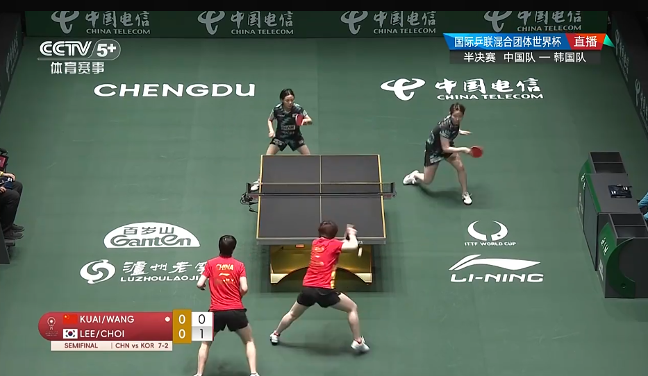 第四场女双比赛,蒯曼/王曼昱1-1战平李恩惠/崔孝珠,两局比分为:5-11、14-12。最终,中国队大比分8-3打败韩国队。